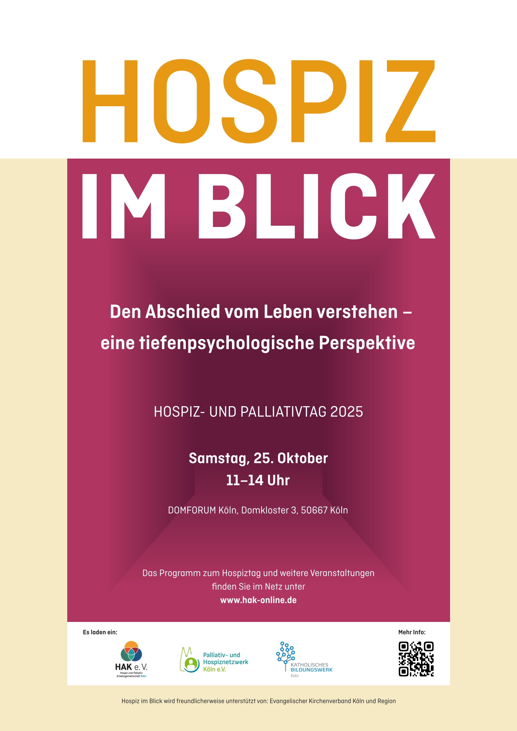 Hospiz im Blick „Den Abschied vom Leben verstehen –eine tiefenpsychologische Perspektive“ Samstag, 25. Oktober 202511–14 UhrDOMFORUM Köln, Domkloster 3, 50667 Köln Das detaillierte Programm zum Hospiztag finden Sie hier und